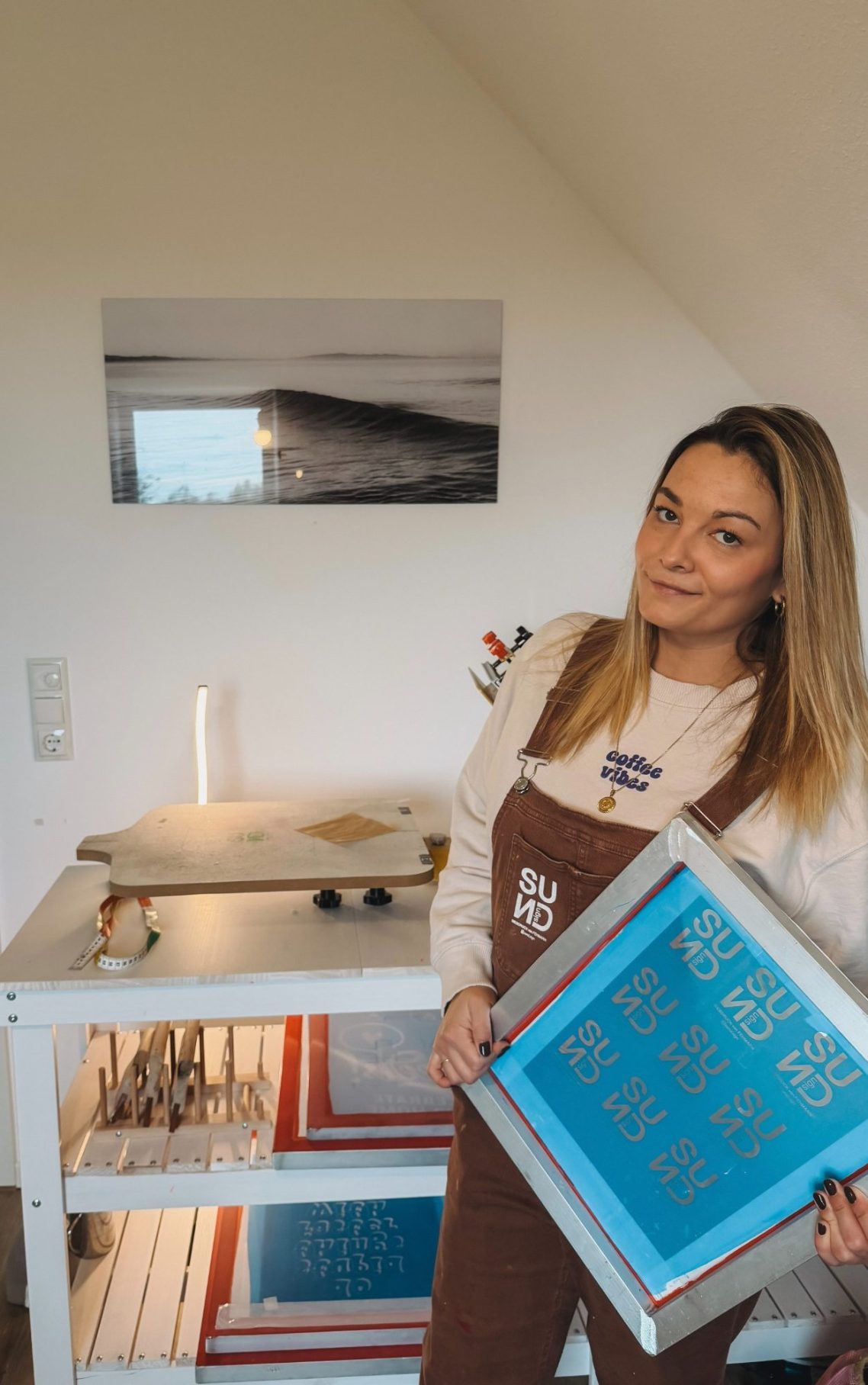Was als Experiment begann, wurde zu einer Leidenschaft. Mich fasziniert der Moment, wenn sich die Farbe durch das Sieb auf den Stoff legt. Die Idee wird Wirklichkeit, wie eine Welle die ihre Spur im Sand hinterlässt. Jeder Druck ist ein einzigartig. Nicht perfekt. Sondern lebendig.